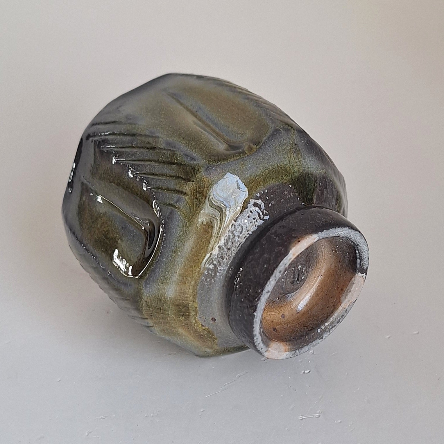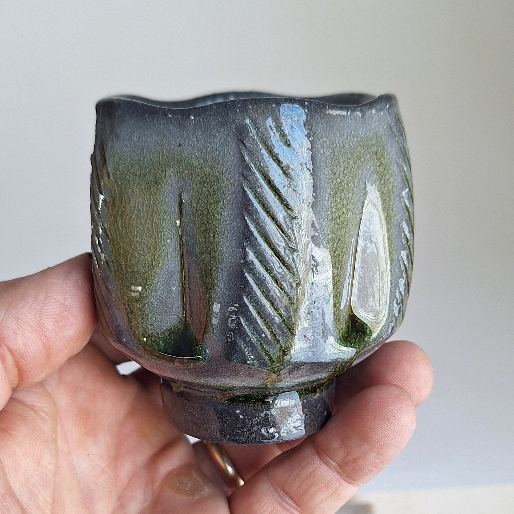 Cut sided cup with ash glaze and texture. Soda fired