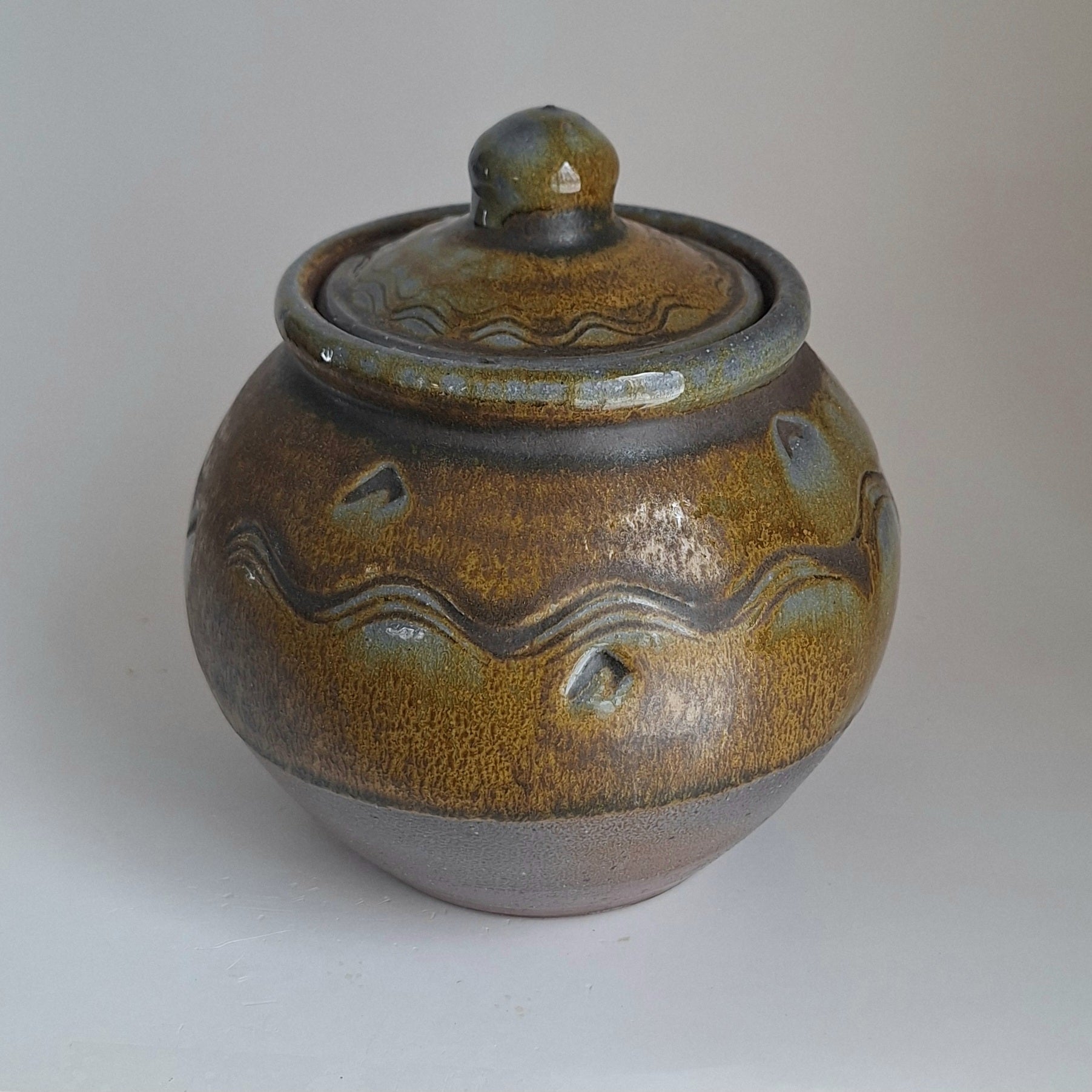 Countertop kitchen storage jar. Good for holding suger, coffee, teabags or loose change. Creek clay and ash glaze. Soda fired.
